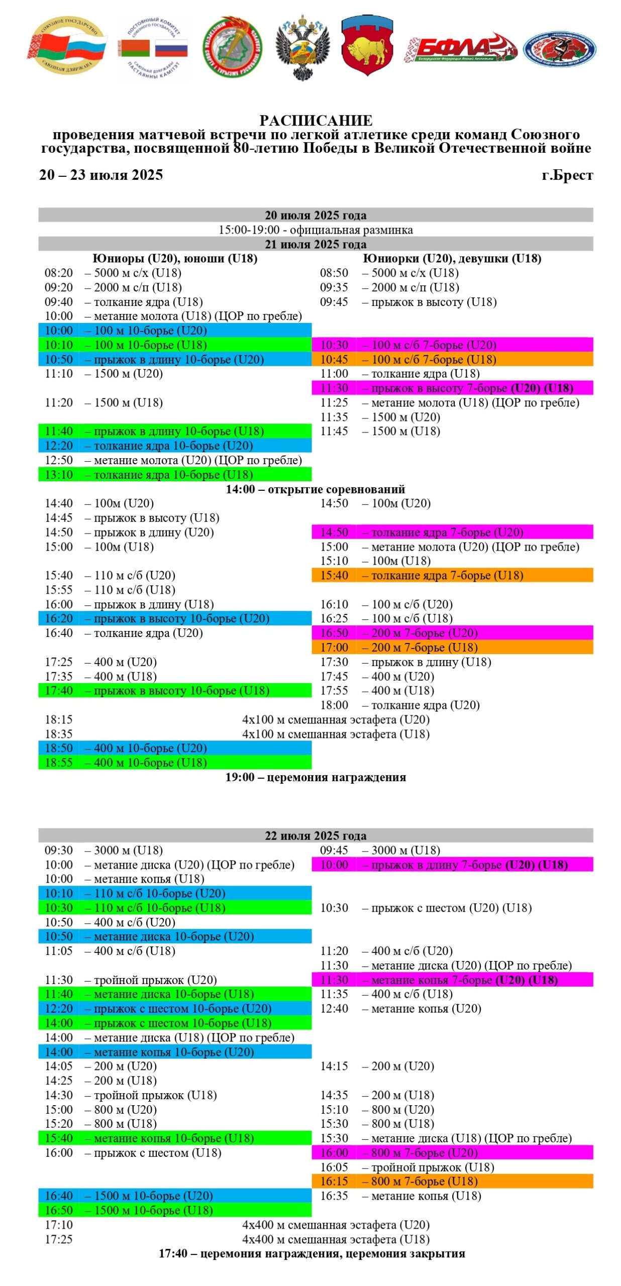 21-22 июля 2025 года в Бресте пройдет Матчевая встреча по легкой атлетике среди команд Союзного государства, посвященной 80-летию победы в Великой отечественной войне среди юниоров и юниорок 2006-2007 гг.р. (U20), юношей и девушек 2008-2009 гг.р. (U18). В турнире примут участие спортсмены белорусской и российской сборных.