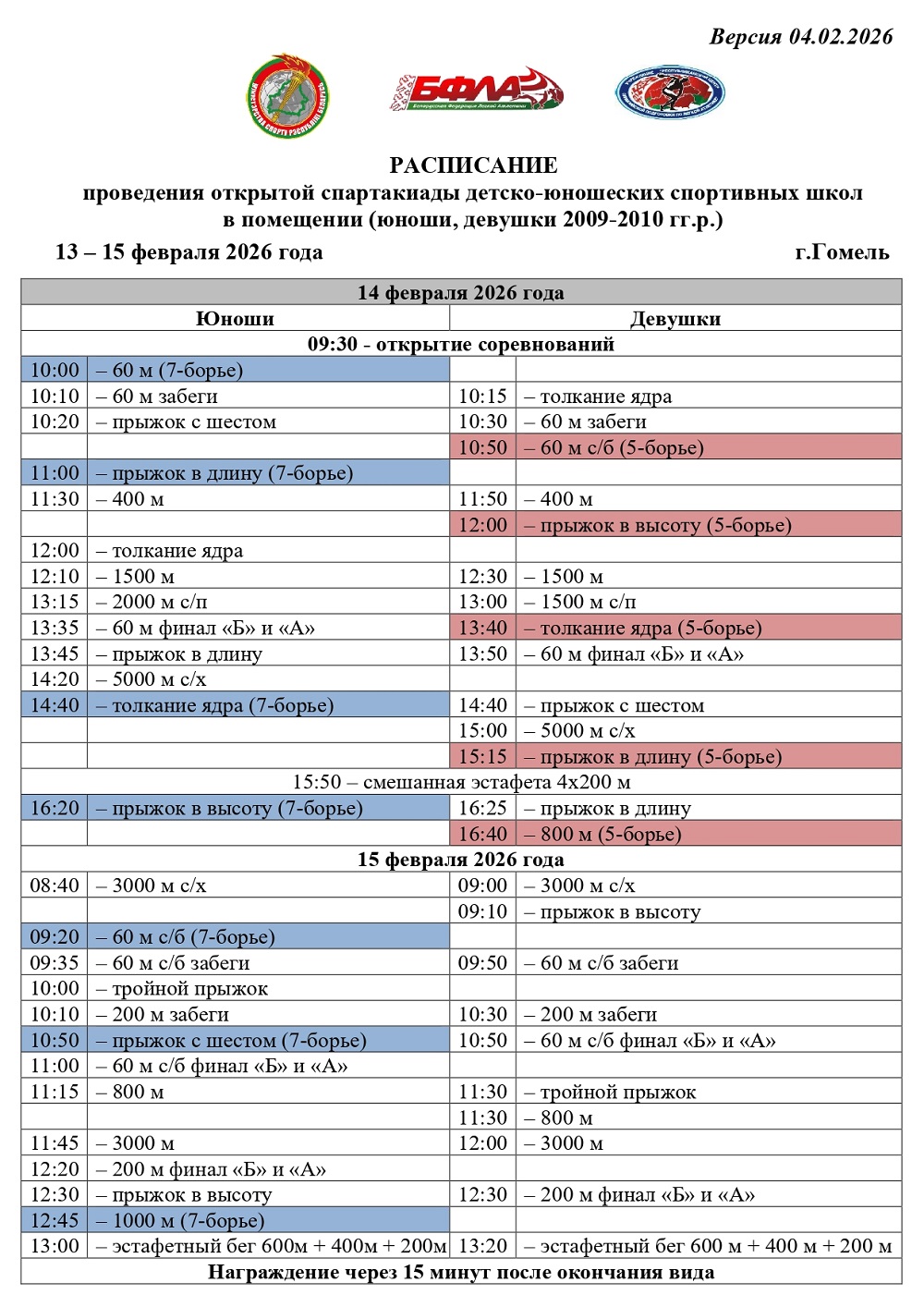 14-15 февраля 2026 года в Гомеле пройдет открытая спартакиада детско-юношеских спортивных школ в помещении среди юношей и девушек 2009-2010 гг.р.