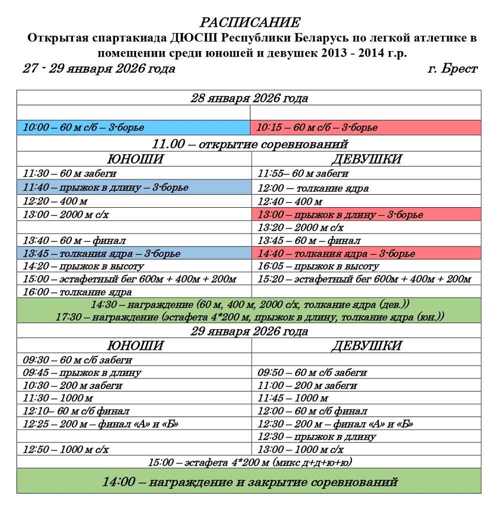 28-29 января 2026 года в Брест пройдет открытая спартакиада детско-юношеских спортивных школ в помещении среди юношей и девушек 2013-2014 гг.р..