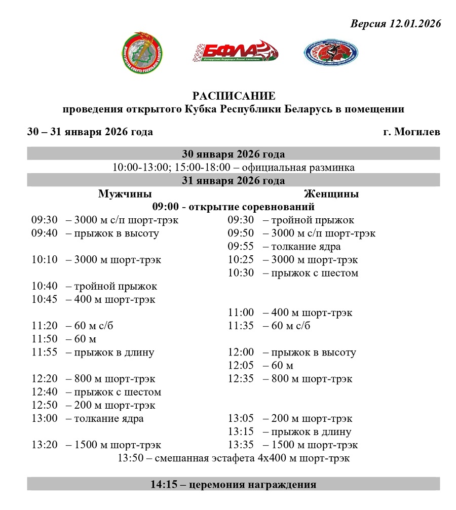 31 января 2026 года в Могилеве пройдет открытый Кубок Республики Беларусь в помещении. Соревнования проводятся в легкоатлетическом манеже СК «Олимпиец».