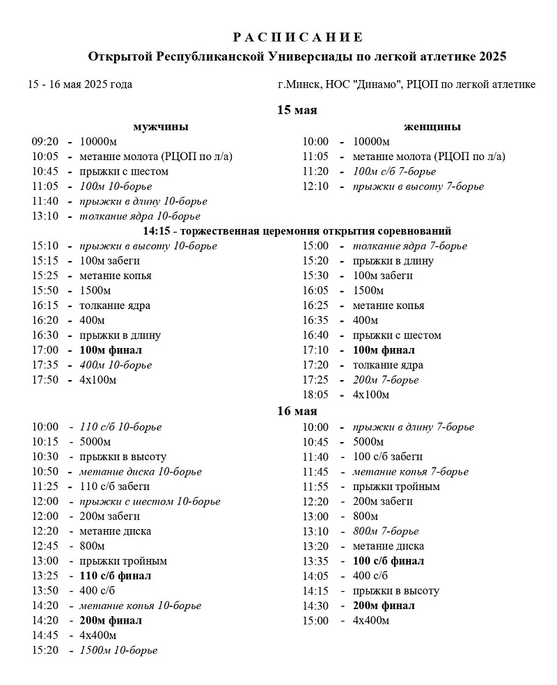 15-16 мая 2025 года в Минске пройдет открытая Республиканская Универсиада по легкой атлетике. Соревнования проводятся на базах ГУ «Национальный олимпийский стадион «Динамо» и учреждении «Республиканский центр олимпийской подготовки по легкой атлетике» (метание молота) .