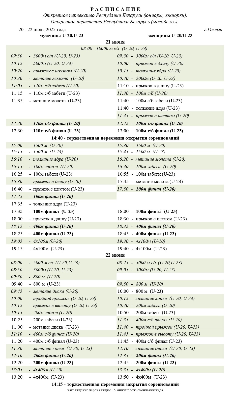 21-22 июня 2025 года в Гомеле пройдут открытое первенство Республики Беларусь среди юниоров и юниорок 2006-2007 гг.р. (U20) и открытое первенство Республики Беларусь среди молодежи 2003-2005 гг.р. (U23) .