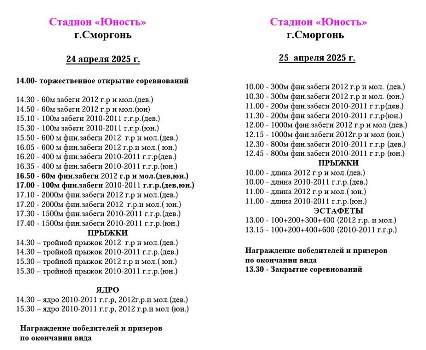 24-25 апреля 2025 года в г. Сморгонь пройдут открытые республиканские соревнования по легкой атлетике «Дружба-2025» памяти Барташевича С.С. среди учащихся 2010-2011, 2012 г.р. и моложе. Соревнования проводятся на стадионе «Юность».