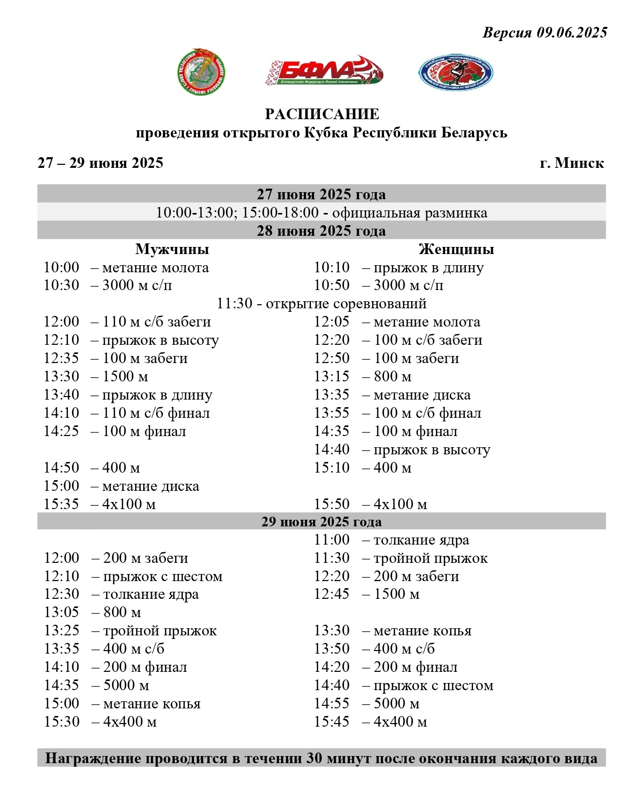 28-29 июня 2025 года в Минске пройдет открытый Кубок Республики Беларусь по легкой атлетике.