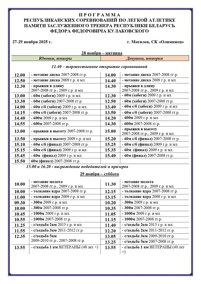 28-29 ноября 2025 года в г. Могилеве на базе спортивного комплекса «Олимпиец» пройдут республиканские соревнования по легкой атлетике памяти Заслуженного тренера Республики Беларусь Федора Федоровича Кулаковского. В соревнованиях принимают участие спортсмены двух возрастных категорий: юниоры и юниорки 2007-2008 гг.р и юноши и девушки 2009 г.р. и моложе.